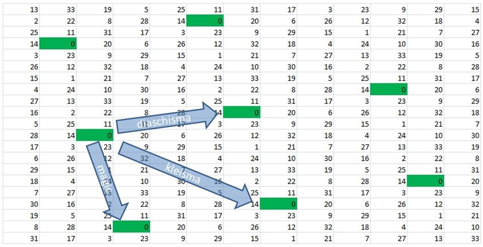 Each square represents a pitch class, e.g. the pitch C in conventional tuning. C can exist in any octave, but if we just ignore the octave, it's plain old C. There are 12 such pitch classes in conventional tuning. Here there are 34, and instead of using letters I use numbers. Since we're ignoring octaves, one microstep up from pitch class 33 is 0.
